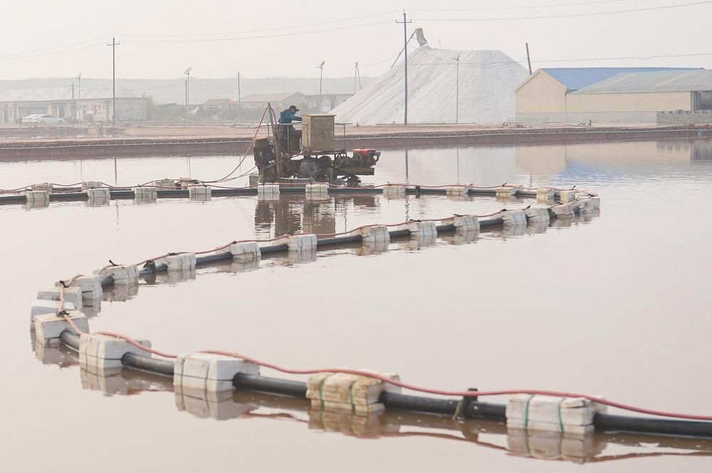 图为河北南堡盐场有限公司的工人正在操作扒盐机。杜雯拓 摄
