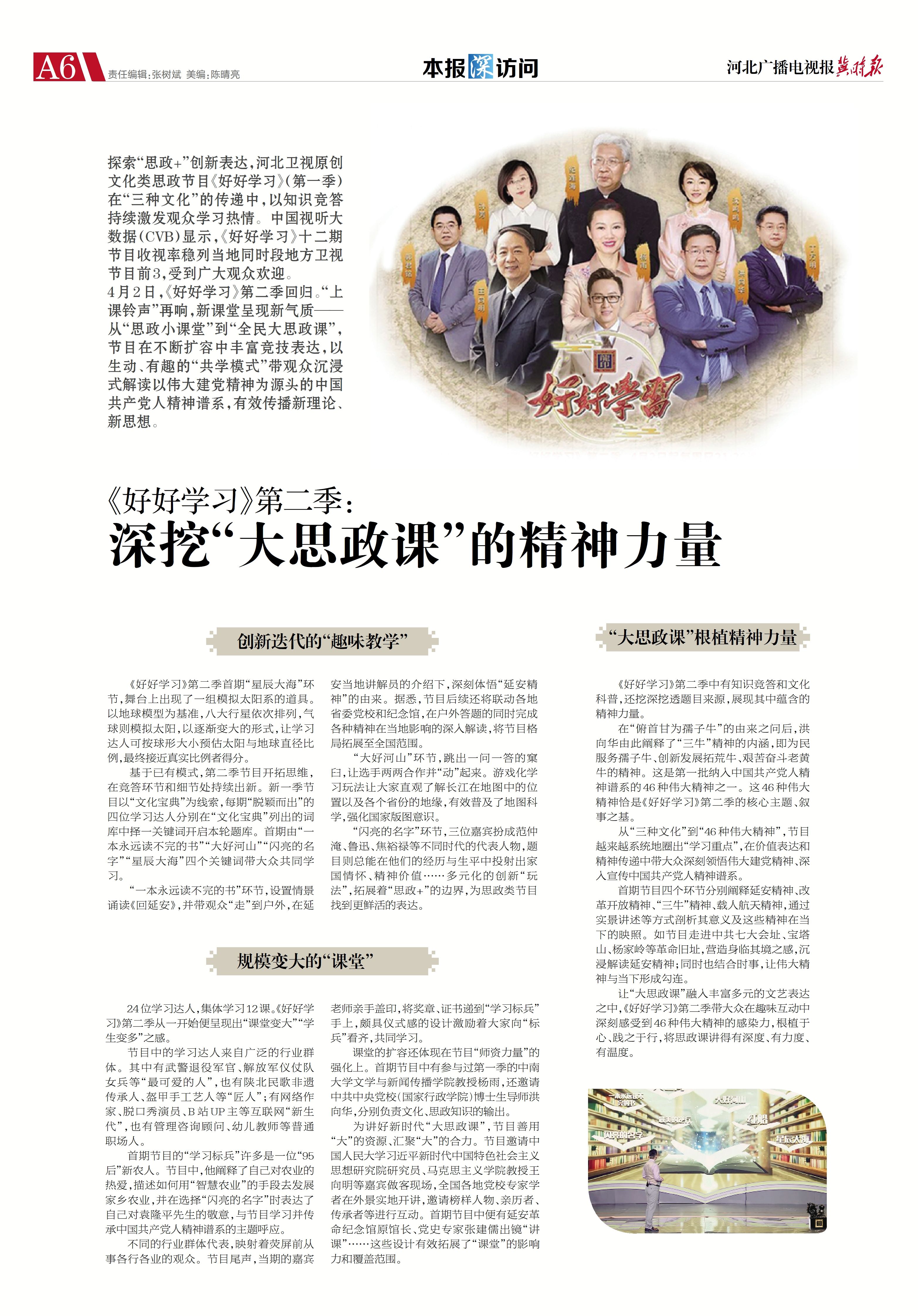 探索“思政+”创新表达,河北卫视原创文化类思政节目《好好学习》(第一季)在“三种文化”的传递中,以知识竞答持续激发观众学习热情。中国视听大数据(CVB)显示,《好好学习》十二期节目收视率稳列当地同时段地方卫视节目前3,受到广大观众欢迎。