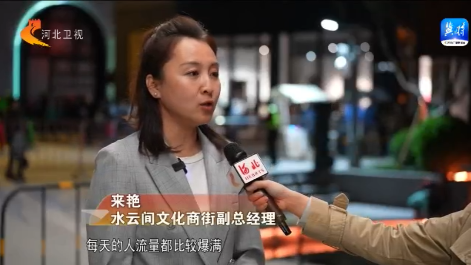 河北广播电视台记者李子涵:“来到了廊坊市的水云间,总有一种置身于江南的神奇感觉。那么我现在就乘坐着这里特色的摇橹船,行驶在街区的中心河中。这里将光影艺术与仿古建筑交相融合,一家家特色的餐饮吸引了不少京津游客前来游玩。”