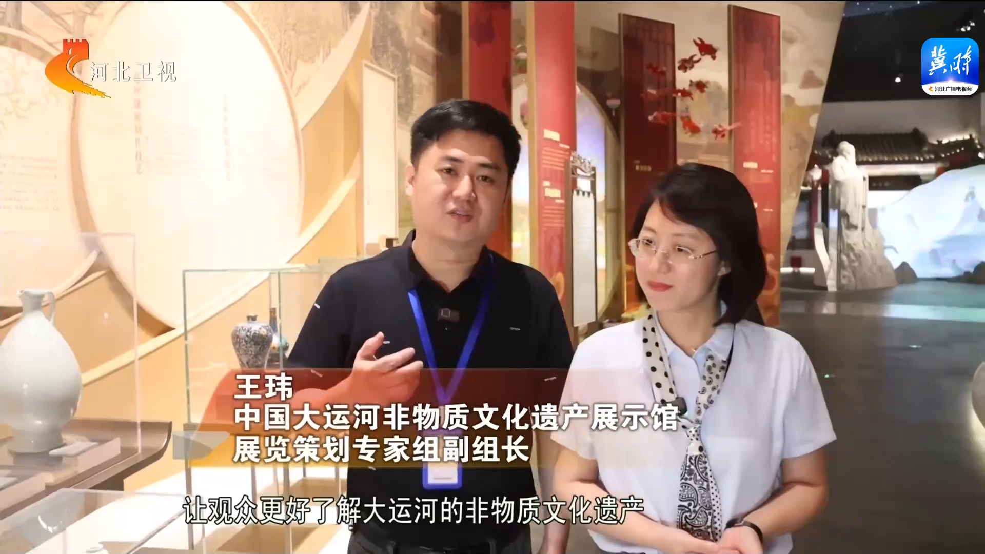 河北广播电视台记者张蕾:“‘运河绕郭流滔滔,高桅大舵长短篙’,古人用诗句描述着当年运河的繁华与兴盛,在中国大运河非物质文化遗产展示馆,我们就可以体验到大运河沿线独特的人文风情与多元的民间艺术。”
