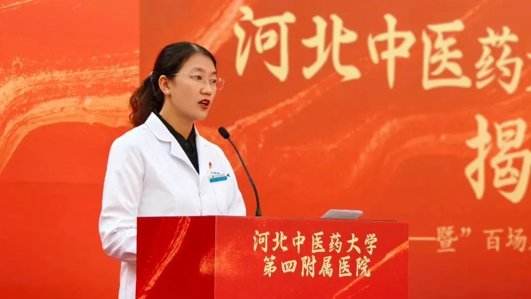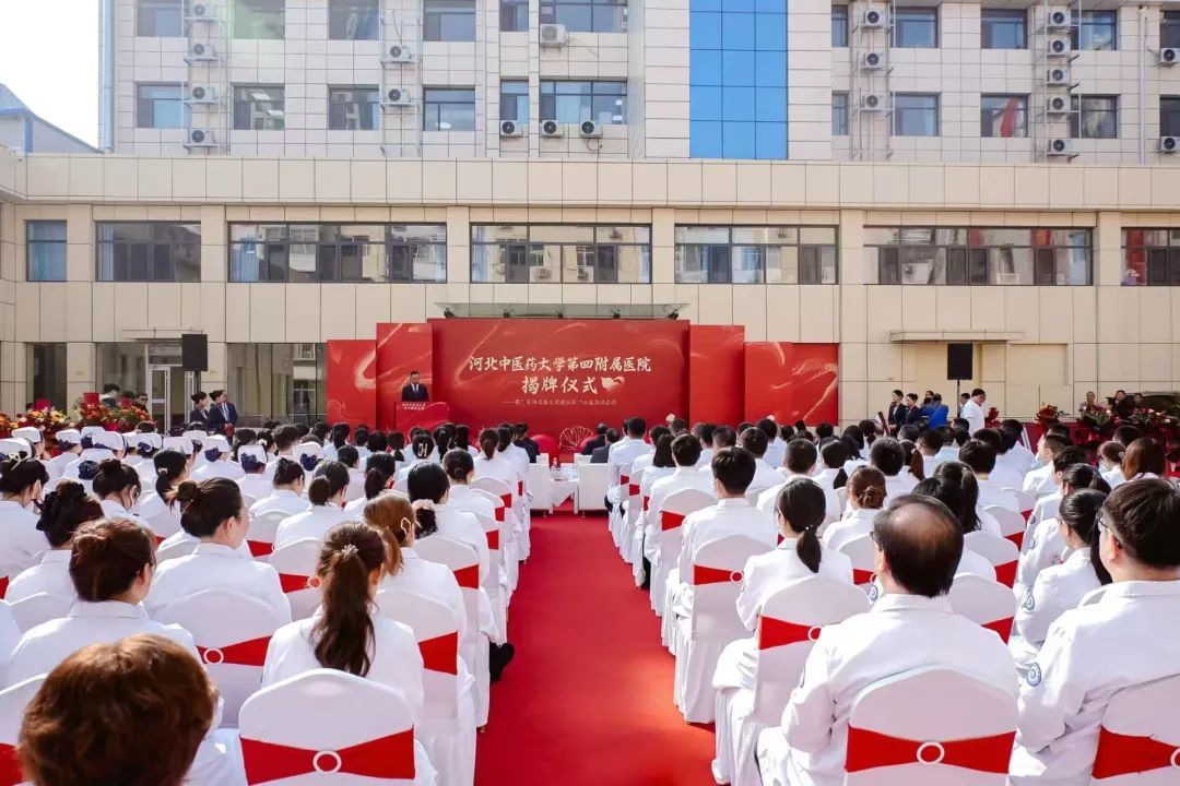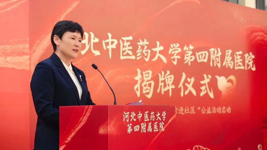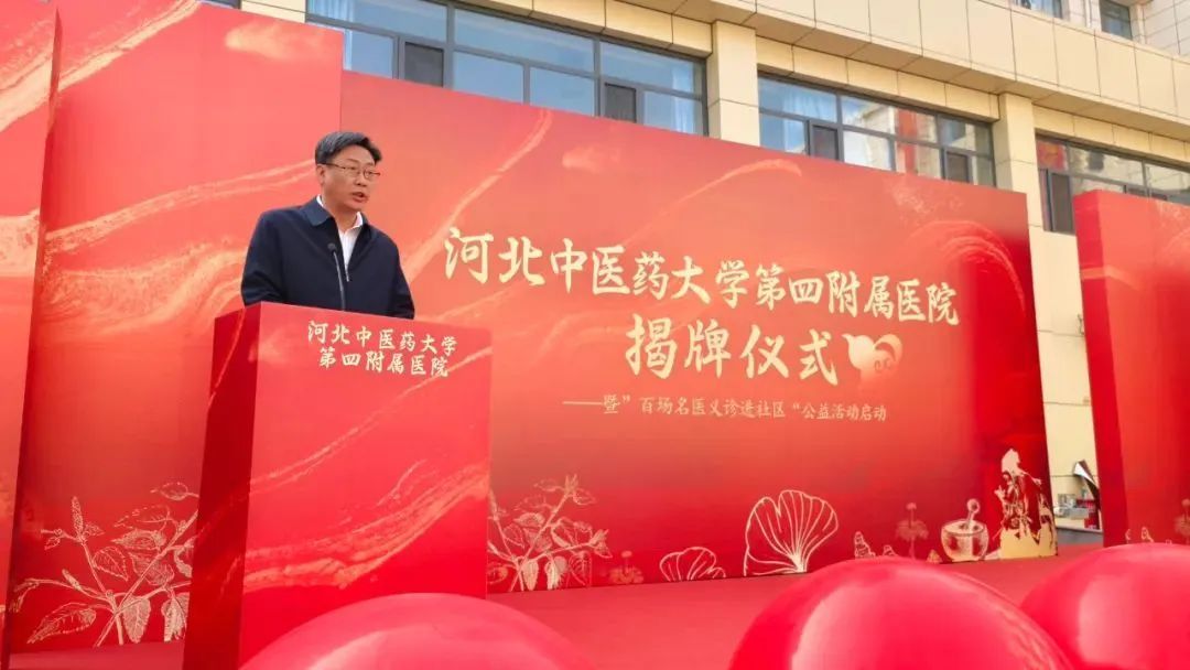 河北中医药大学第四附属医院党委书记、院长陈虎代表医院党委向参加揭牌仪式的各位领导和嘉宾表示热烈欢迎,他满怀深情回顾了过去的历史,介绍了现状,饱含激情对医院今后的发展规划和努力方向进行了展望。医院将建设成为河北中医药大学优秀临床实习基地,为理论教学与临床实践融合创造更广阔空间,为中医药事业发展培养更多优秀人才;医院将积极筹备新院区建设,致力于为患者提供更优质的中医药服务;医院将努力打造更高水平科研平台,汇聚各方科研力量,继续持续深入开展中医药研究,推动中医药事业迈向更高水平。