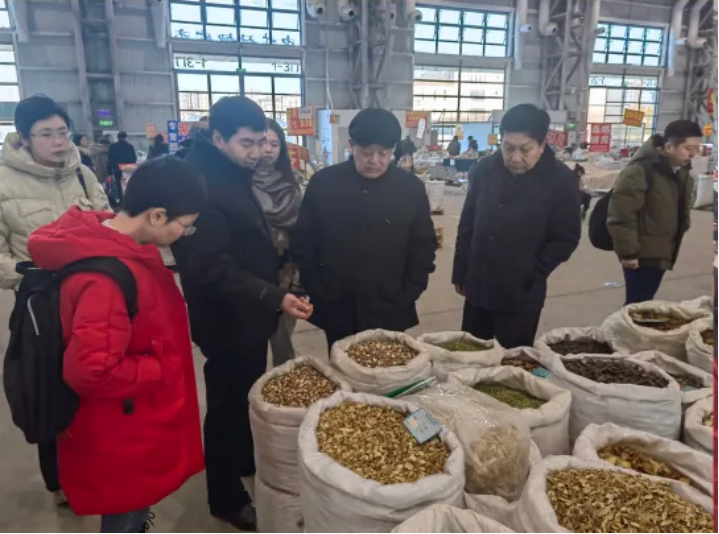 2024年12月7日,中国民族医药协会食药健康工作委员会名誉会长邵刚等一行14人到安国,实地考察了安国中药材交易市场,河北省医药行业协会副书记智建国、副会长陶丽敏、安国市市场监管局相关领导陪同参观。