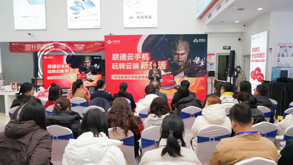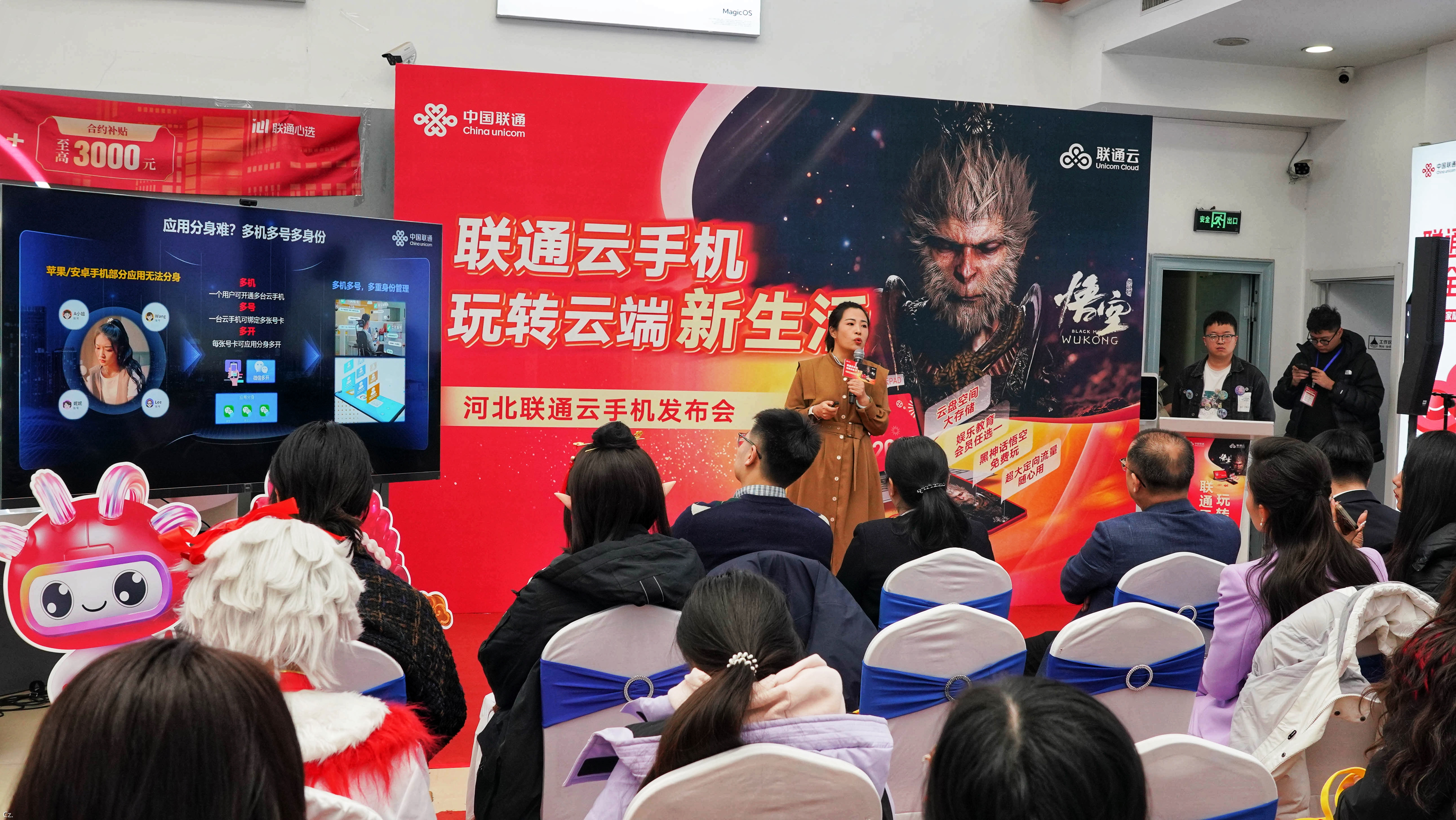 2025年1月22日,河北联通在河北石家庄中山旗舰厅成功举办“联通云手机·玩转云端新生活”——河北联通云手机发布会,重磅发布云手机产品并现场体验《黑神话:悟空》等热门游戏。河北联通市场部副总经理陈丽丽、公众客户事业部副总经理耿杰、战略客户中心副总经理万园华,华为河北代表处运营商副总经理彭浩胜,石家庄联通副总经理张涛、市场部总经理鲁宏丽等莅临活动现场并参加发布仪式。