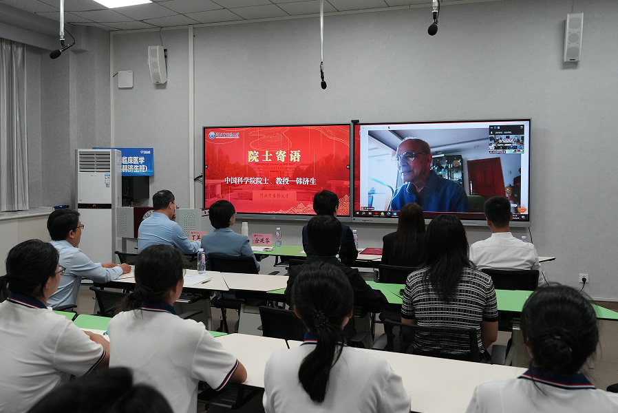 韩济生院士通过视频连线饱含深情地送上寄语,他将60余年的科研历程娓娓道来,情感真挚,令人如沐春风。韩济生院士严谨求实、勇于创新的科学精神感动激励了所有师生。