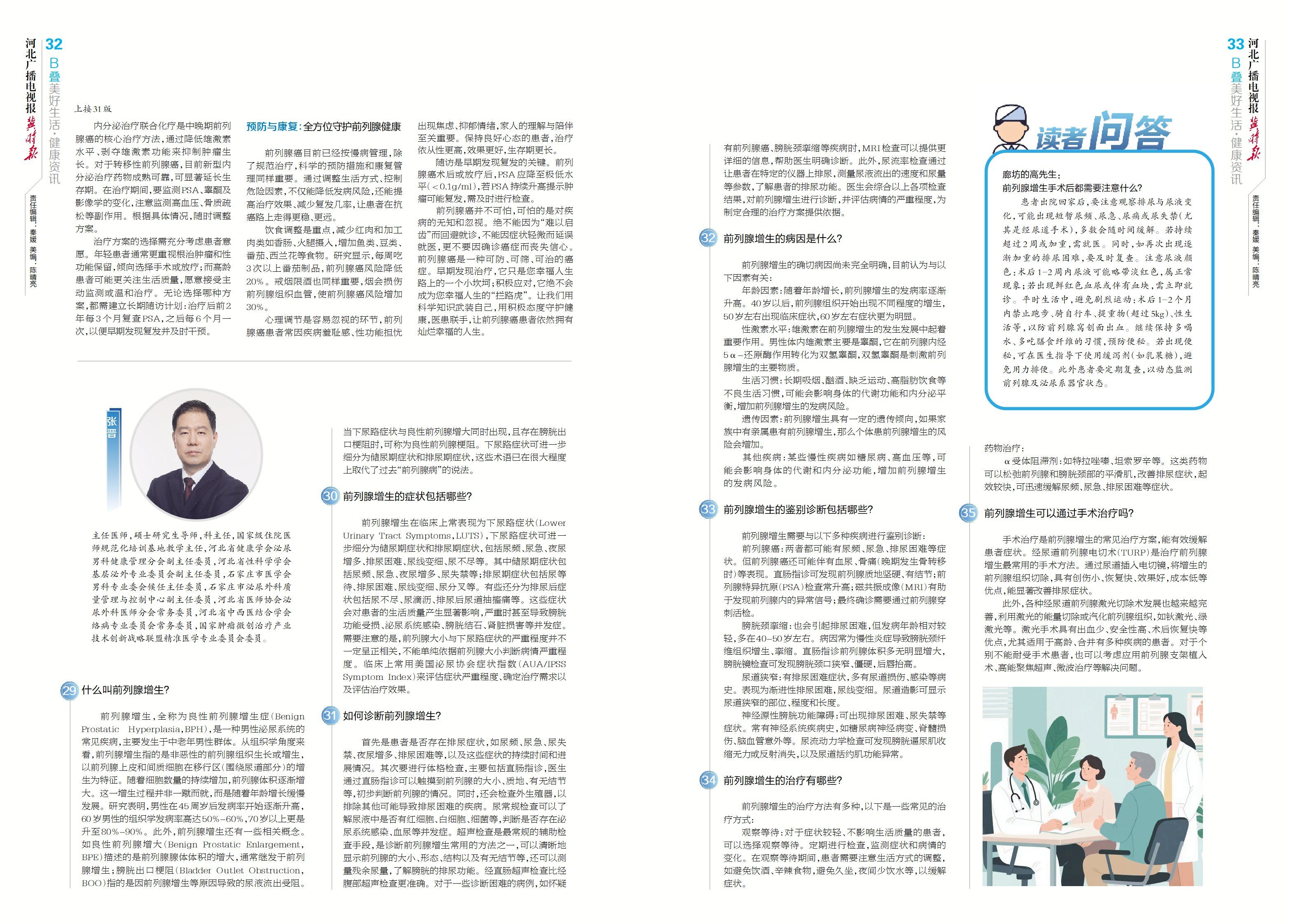 本期主讲人瞿长宝教授为大家系统解读前列腺癌的防治知识,帮助男性朋友科学应对“前列腺癌”这一健康威胁。接下来是分讲人张晋主任医师解答《泌尿健康100问》中29-35问。