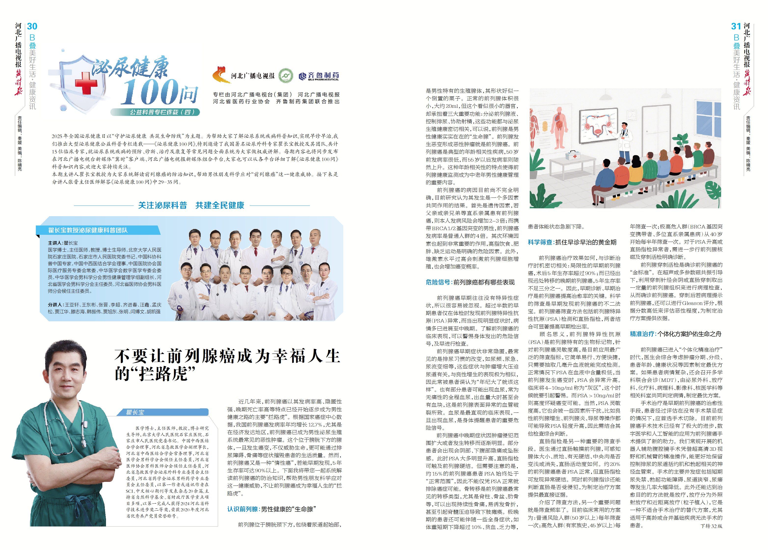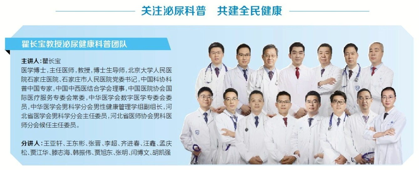 2025年全国泌尿健康日以“守护泌尿健康 共筑生命防线”为主题。为帮助大家了解泌尿系统疾病科普知识,实现早诊早治,我们推出大型泌尿健康公益科普专栏连载——《泌尿健康100问》,特别邀请了我国著名泌尿外科专家瞿长宝教授及其团队,共计15位临床专家,就泌尿系统疾病的预防、诊断、治疗及康复等常见问题全面系统为大家做权威讲解。每期内容也将同步发布在河北广播电视台新媒体“冀时”客户端、河北广播电视报新媒体组合平台,大家也可以从各平台详细了解《泌尿健康100问》科普知识内容,欢迎大家持续关注。