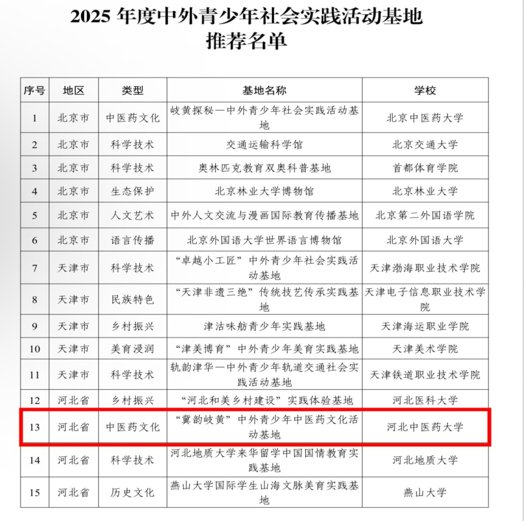 河北中医药大学“冀韵岐黄”中外青少年中医药文化活动基地成功入选2025年度全国“中外青少年社会实践活动基地”推荐名单,该名单由教育部国际合作与交流司委托中国教育国际交流协会,经过在全国范围内开展2025年度“来华留学生中国国情教育优秀课程和中外青少年社会实践活动基地”征集评选,于近日公布。
