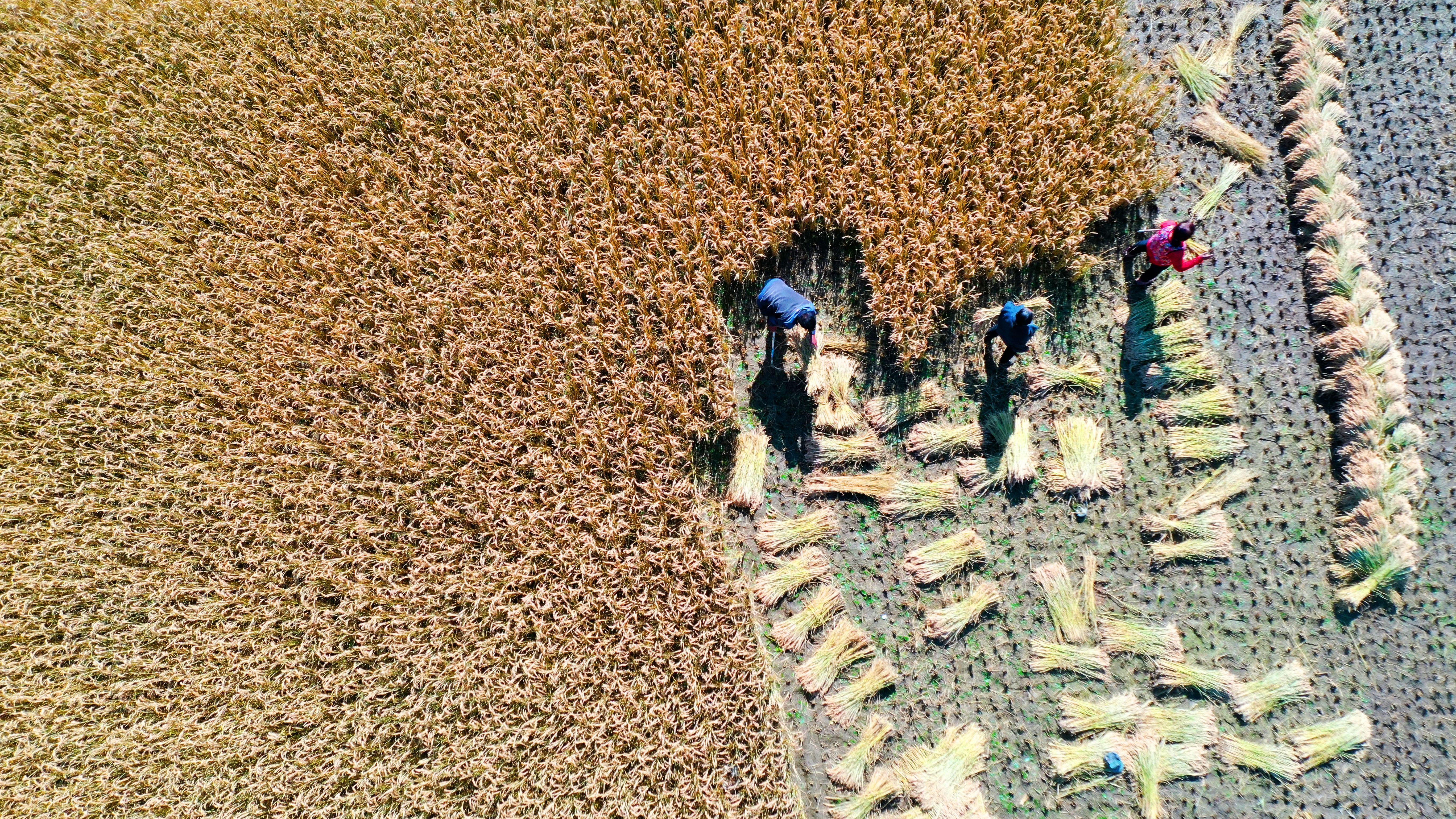 微风拂过,田间泛起层层金色波浪,随处可见农民收割水稻的身影,农户告诉记者,今年的水稻颗粒饱满,亩产能超千斤,收入过万没问题了。
